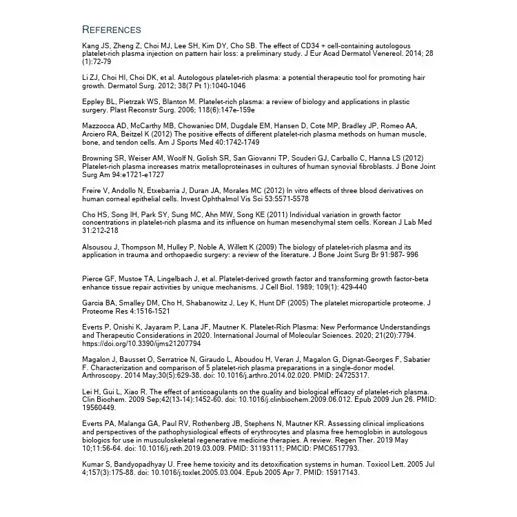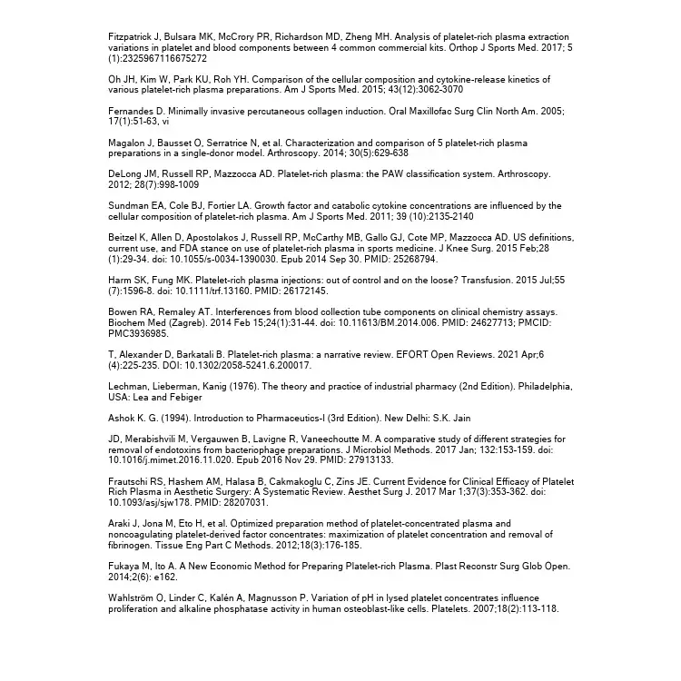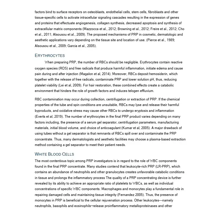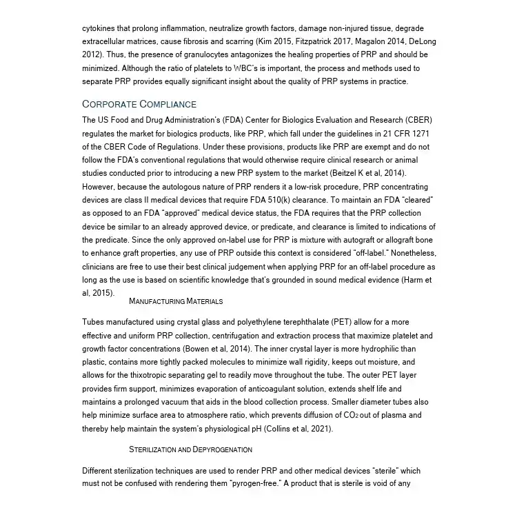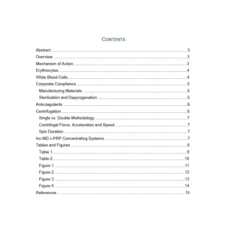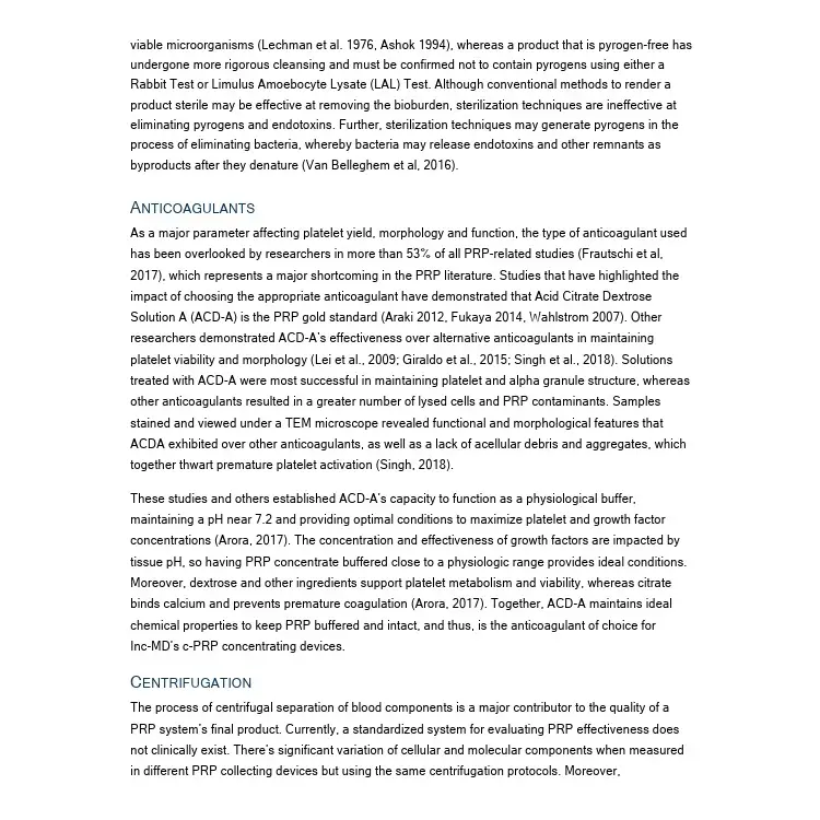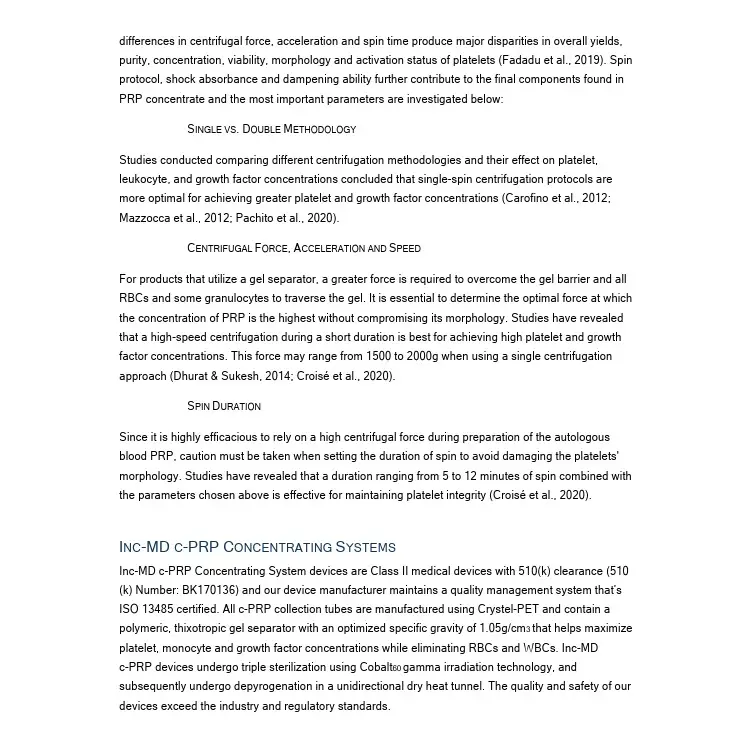 The literature review was used to strengthen IncMD's c-PRP Concentrating Systems, inasfar that it was used to help guide the manufacturing process, compliance, and better our understanding of parameters in the collection, preparation and separation process that directly effect concentration, dose and overal efficiency. The review can be accessed using the link above.