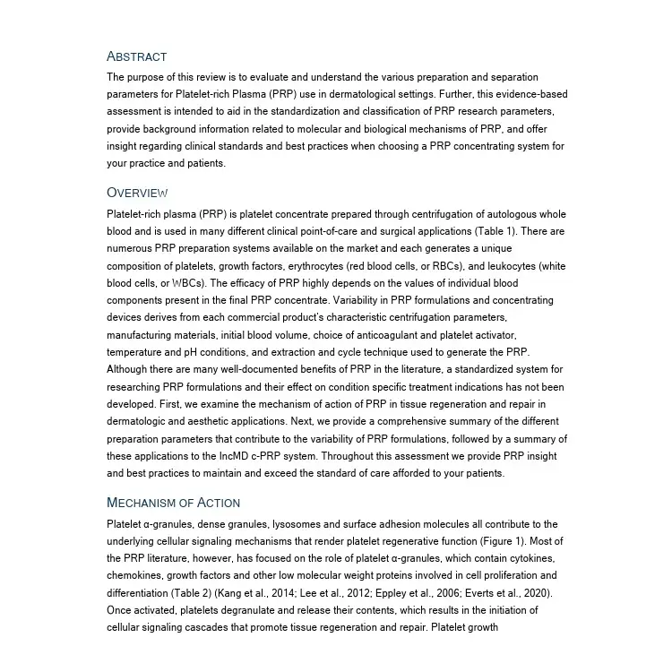 "The purpose of this review is to evaluate and understand the various preparation and separation parameters for Platelet-rich Plasma (PRP) use in dermatological settings. Further, this evidence-based assessment is intended to aid in the standardization and classification of PRP research parameters, provide background information related to molecular and biological mechanisms of PRP, and offer insight regarding clinical standards and best practices when choosing a PRP concentrating system for your practice and patients."